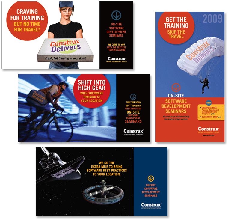 | Client: Construx, software development training Agency: Bicameral Design Copy: Terry Short Photo: Photocomposition from stock by John Engerman (Above) Product: Consulting in agile development (Right) Product: On-site seminars |